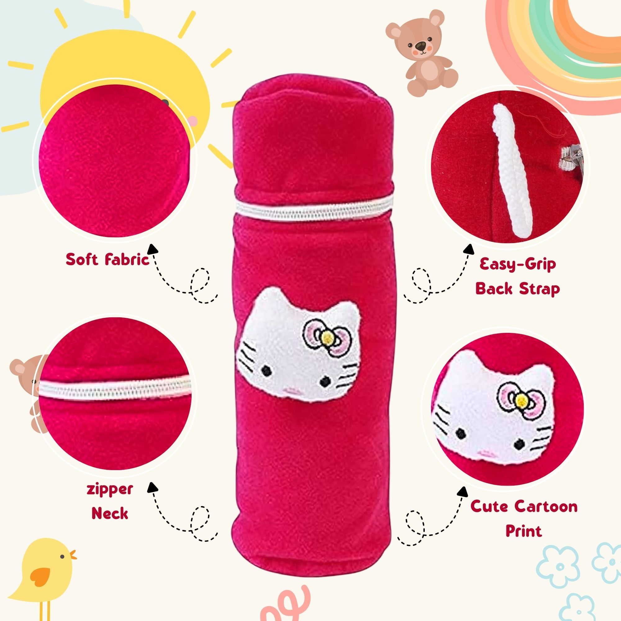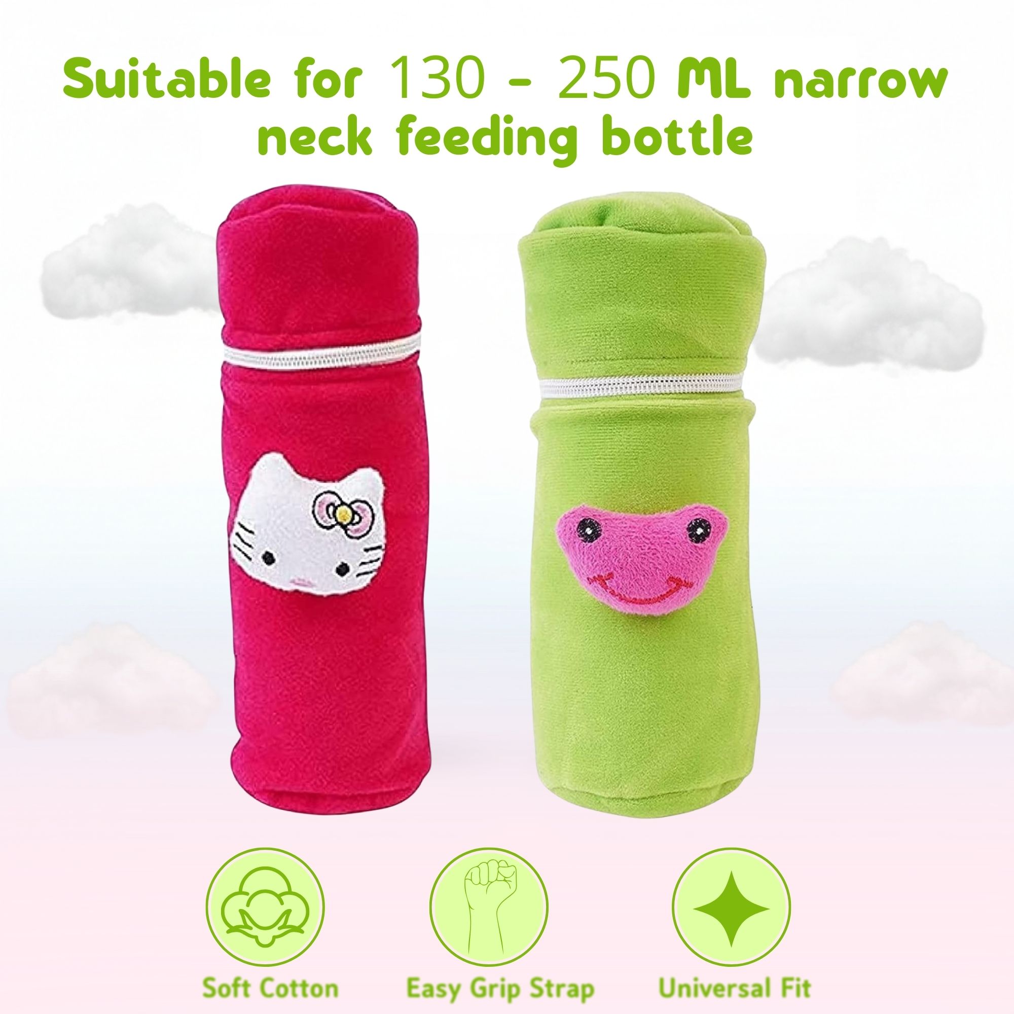 Soft plush stretchable feeding bottle covers with secure zipper closure, designed for 120–250 ml bottles. Adorable animated designs keep feeding fun while protecting bottles. Comes in a pack of 2.