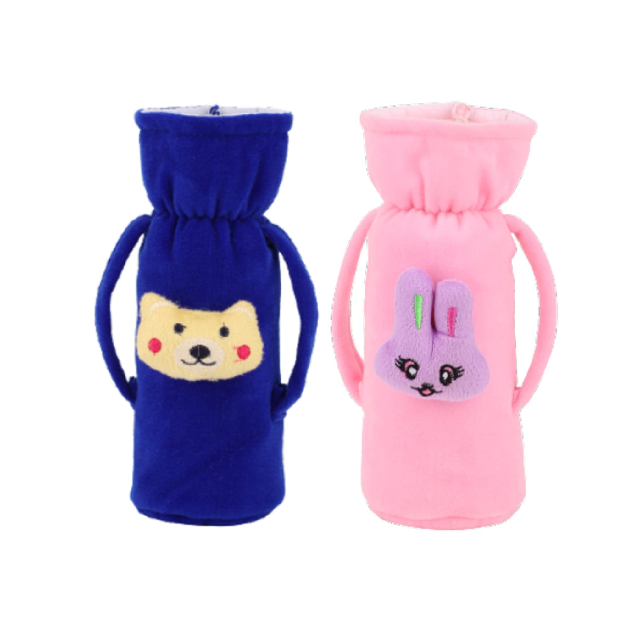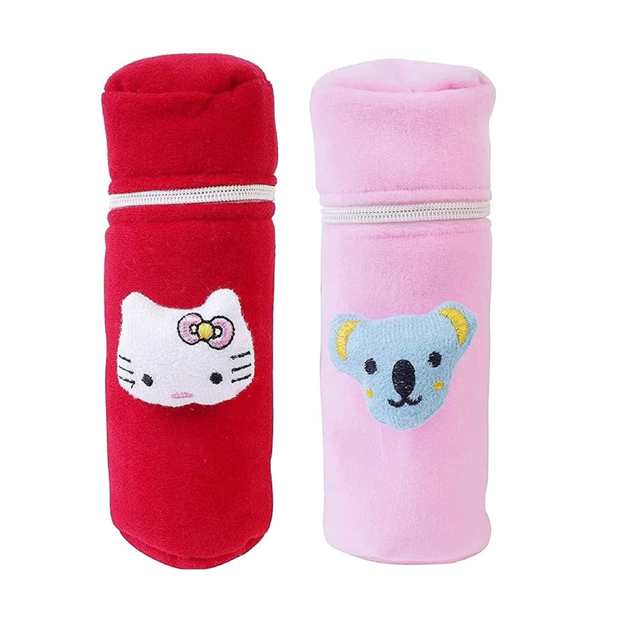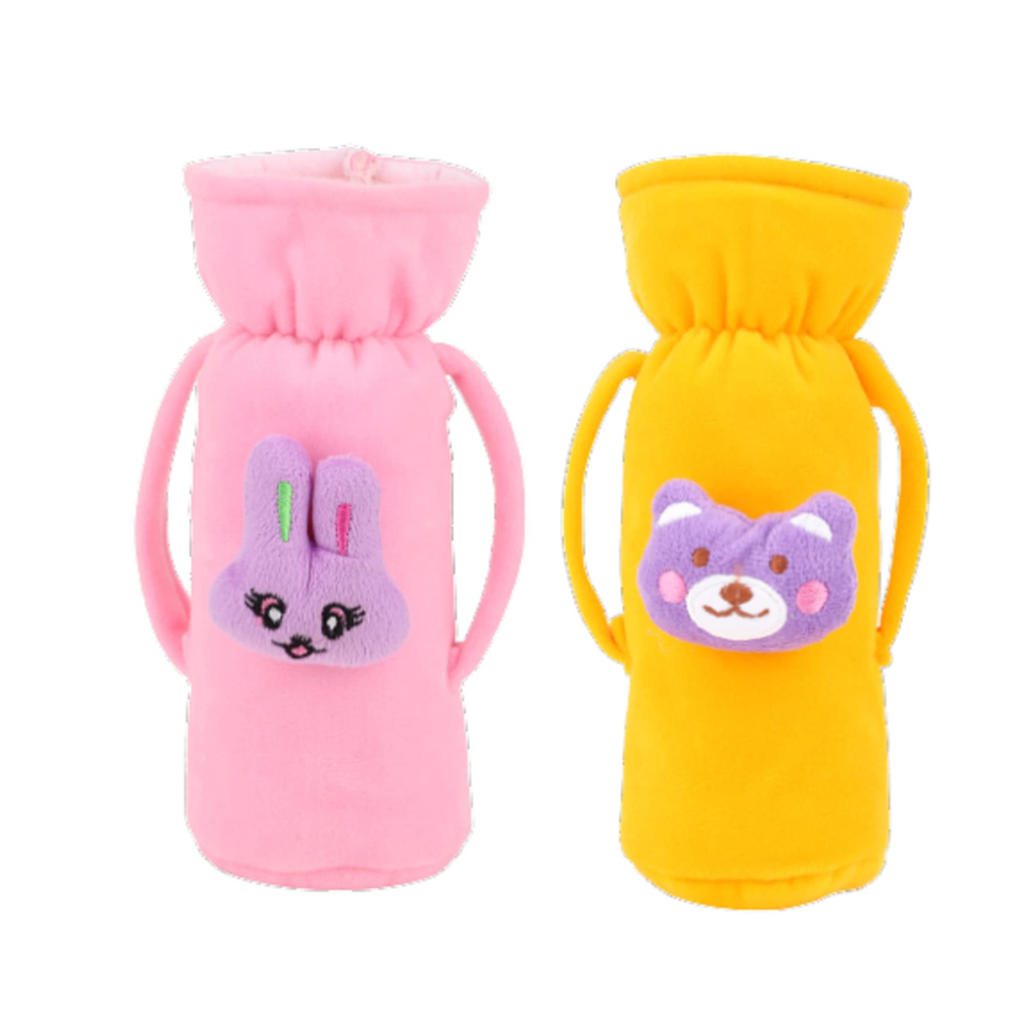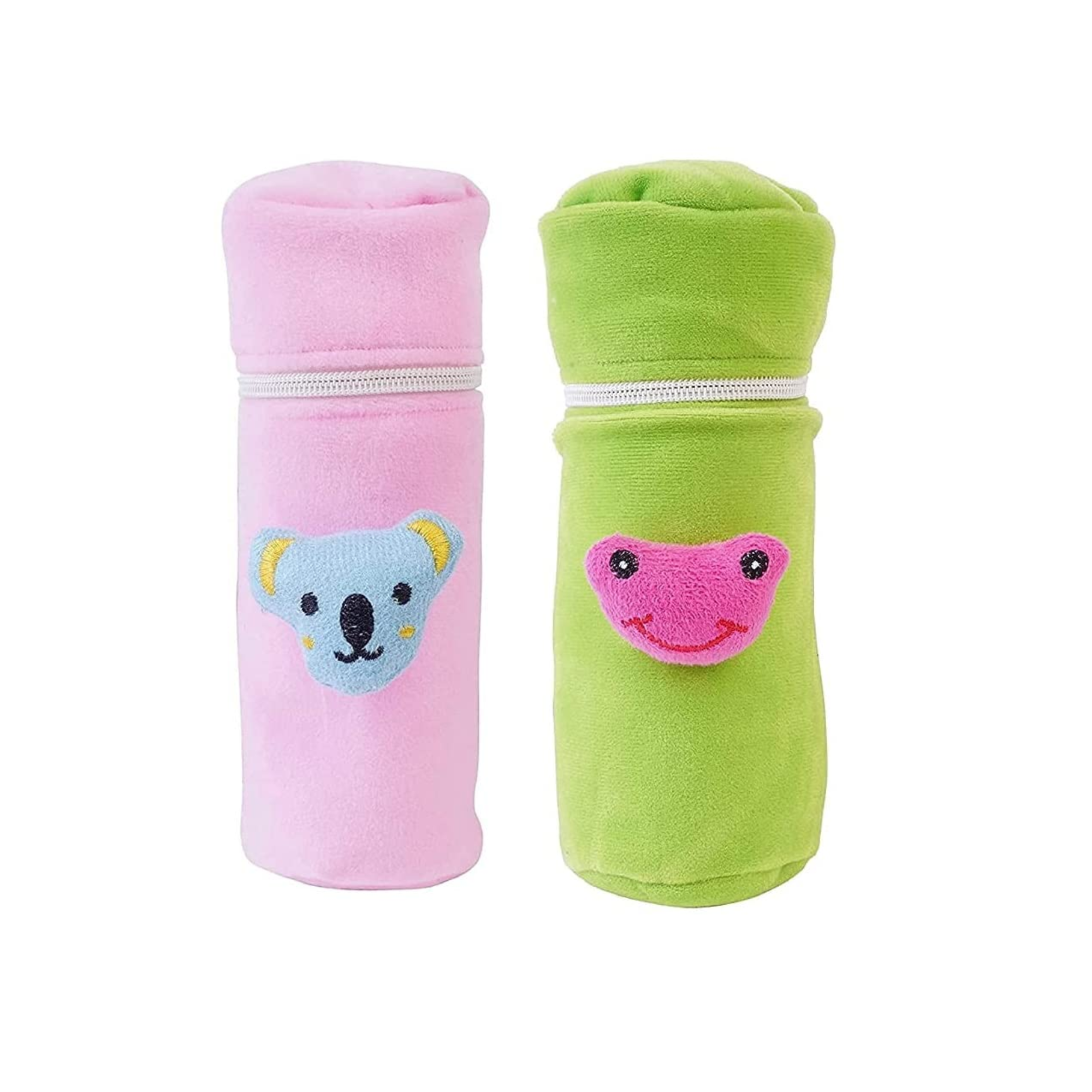 Soft plush stretchable feeding bottle covers with secure zipper closure, designed for 120–250 ml bottles. Adorable animated designs keep feeding fun while protecting bottles. Comes in a pack of 2.