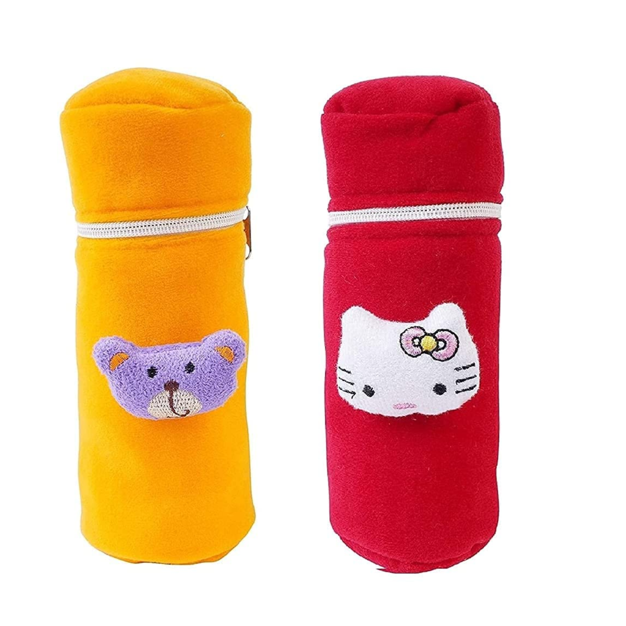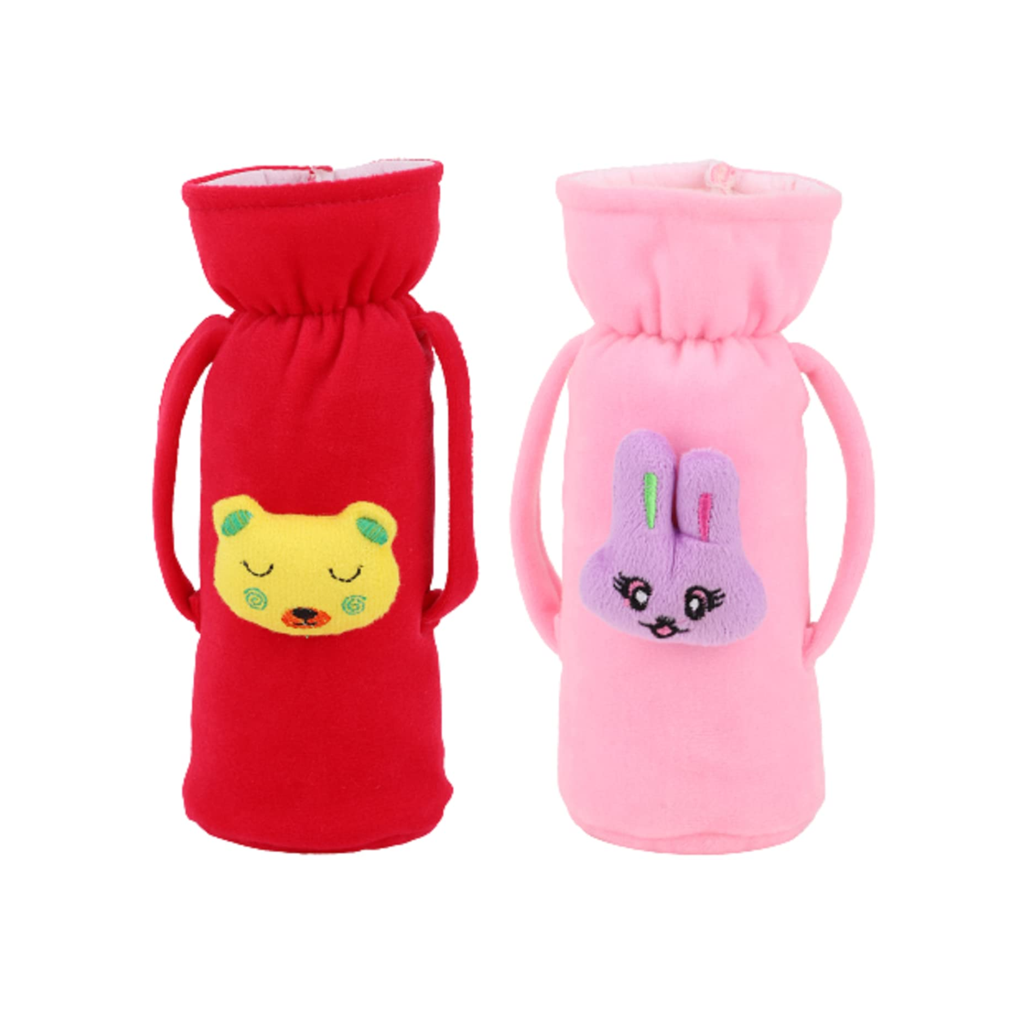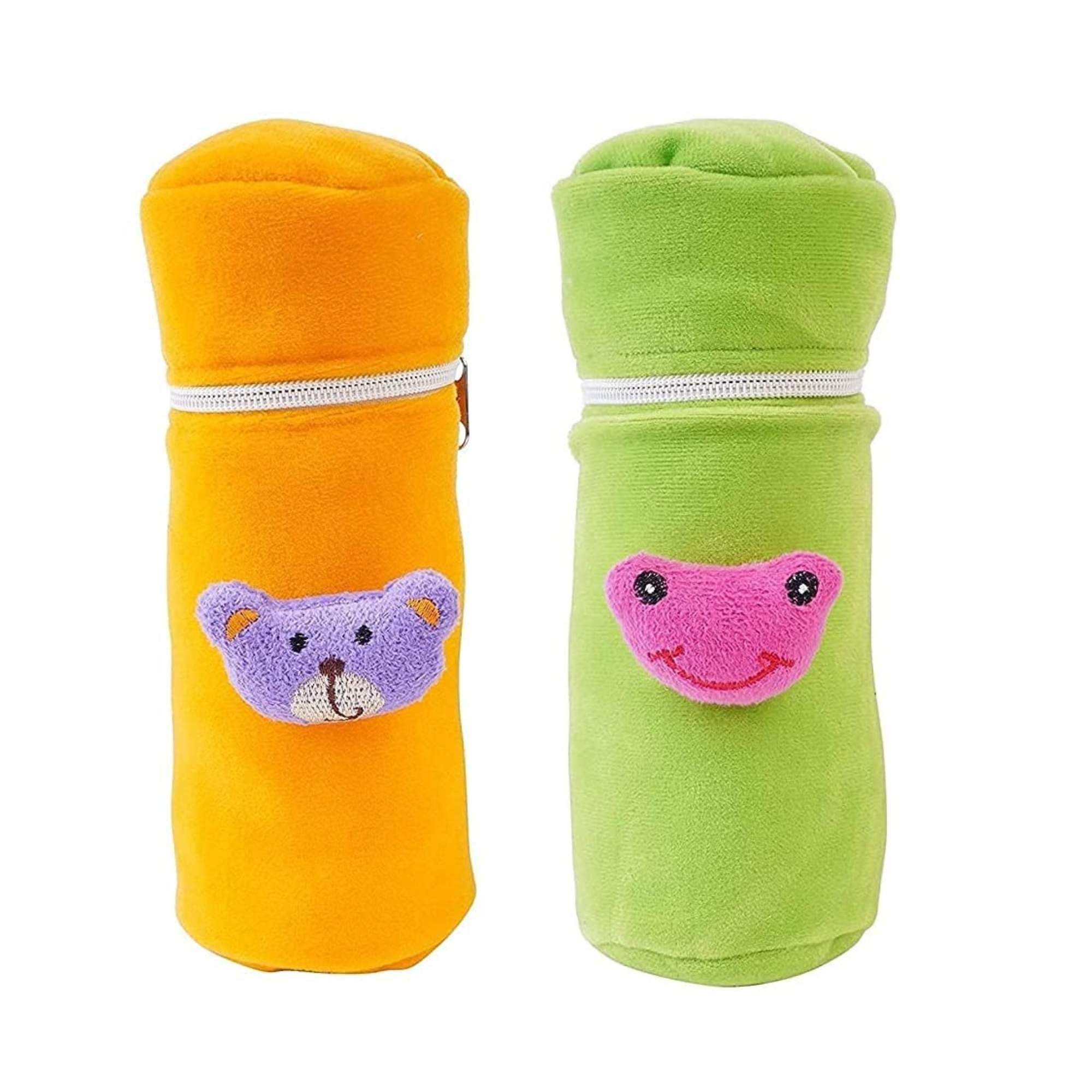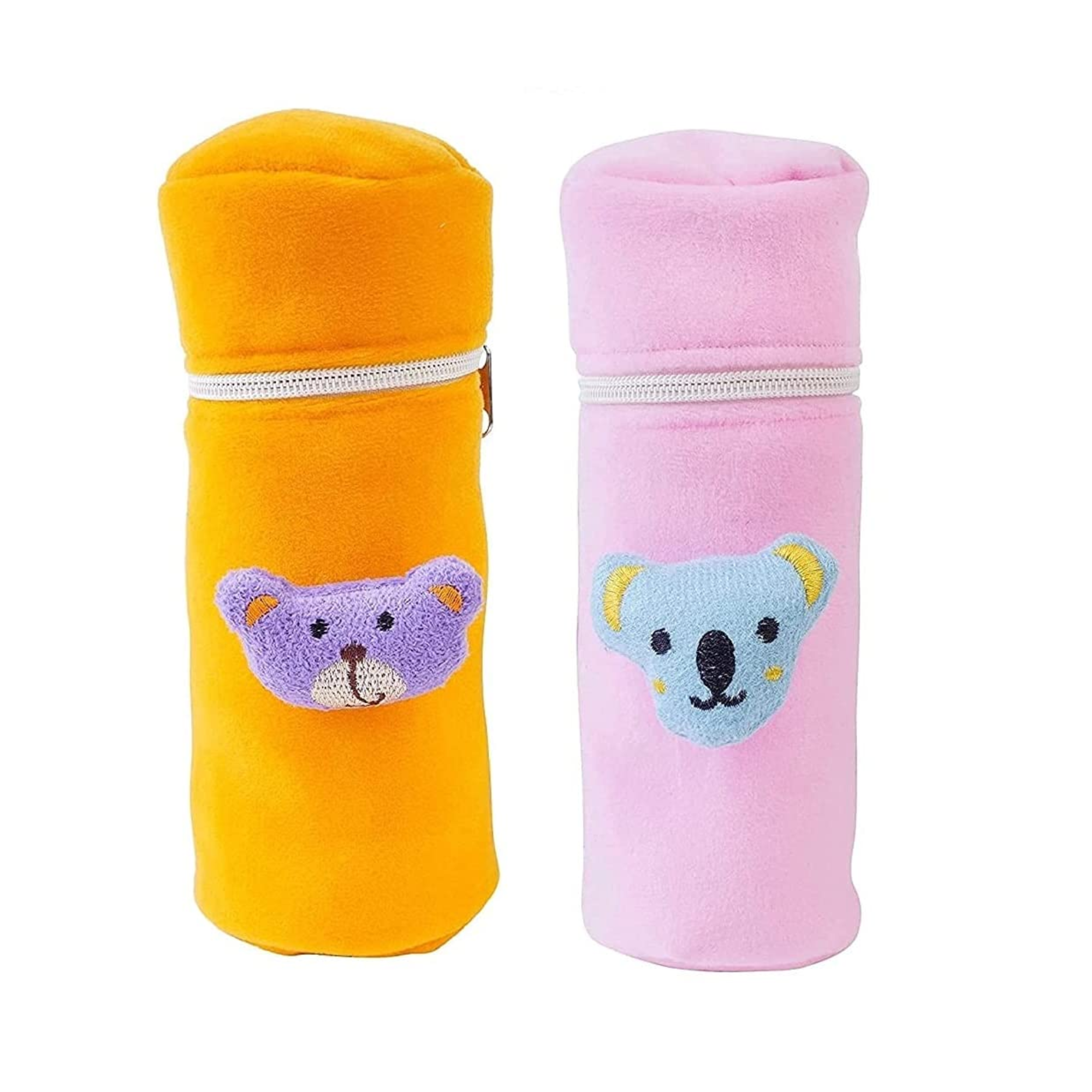 Soft plush stretchable feeding bottle covers with secure zipper closure, designed for 120–250 ml bottles. Adorable animated designs keep feeding fun while protecting bottles. Comes in a pack of 2.