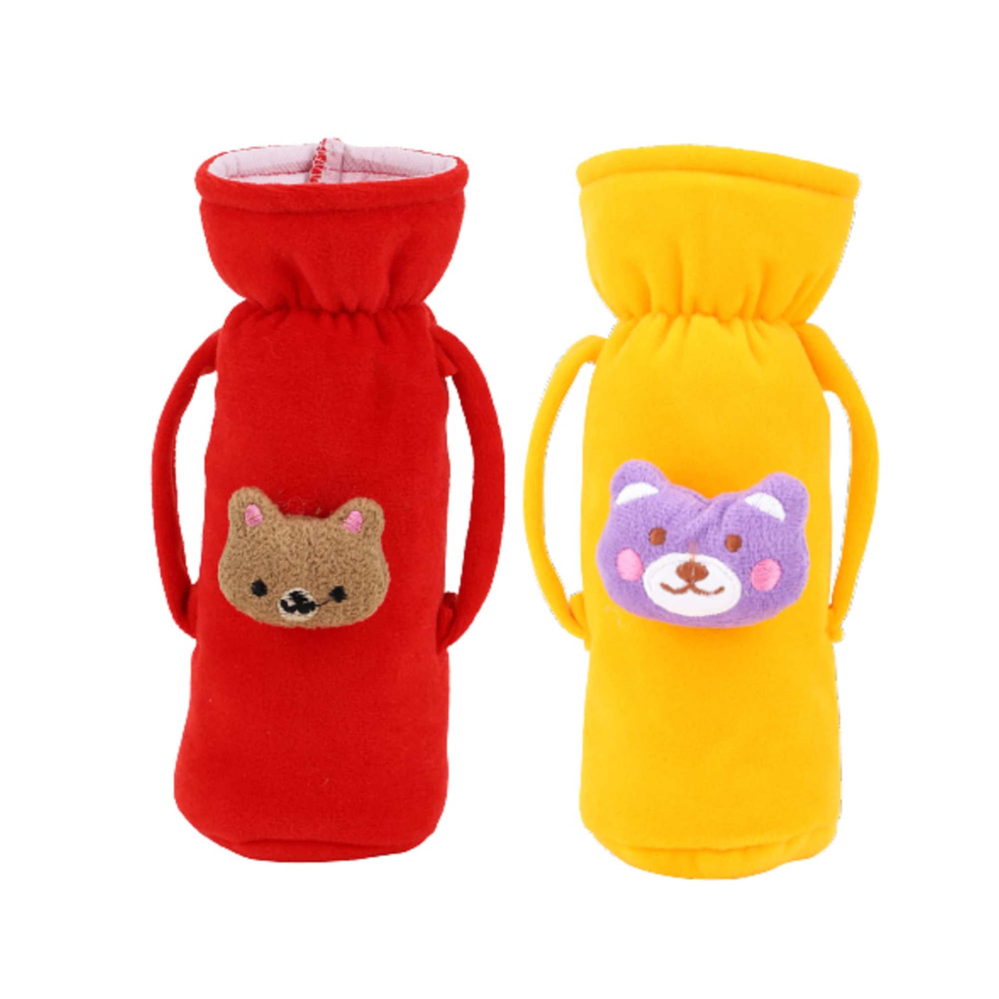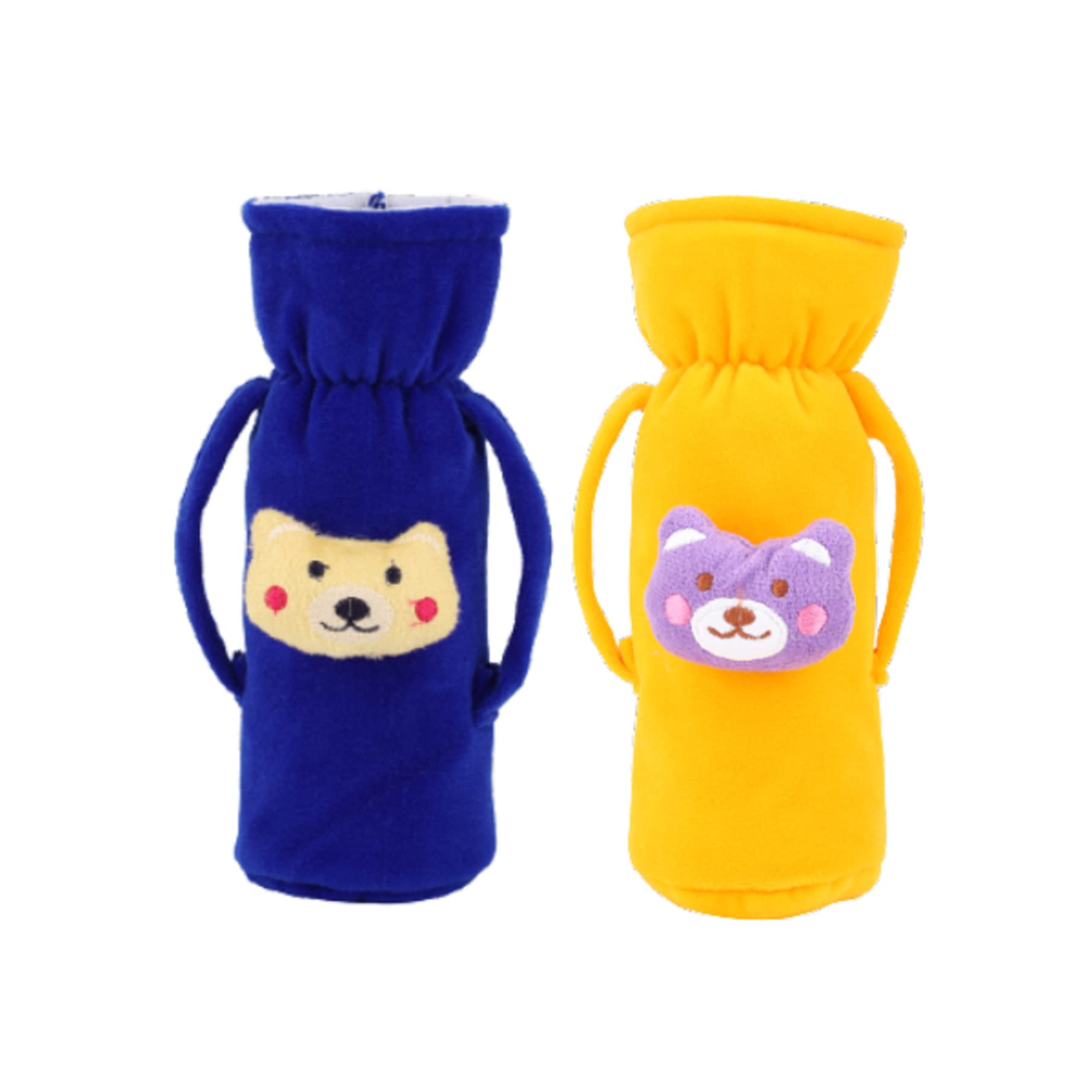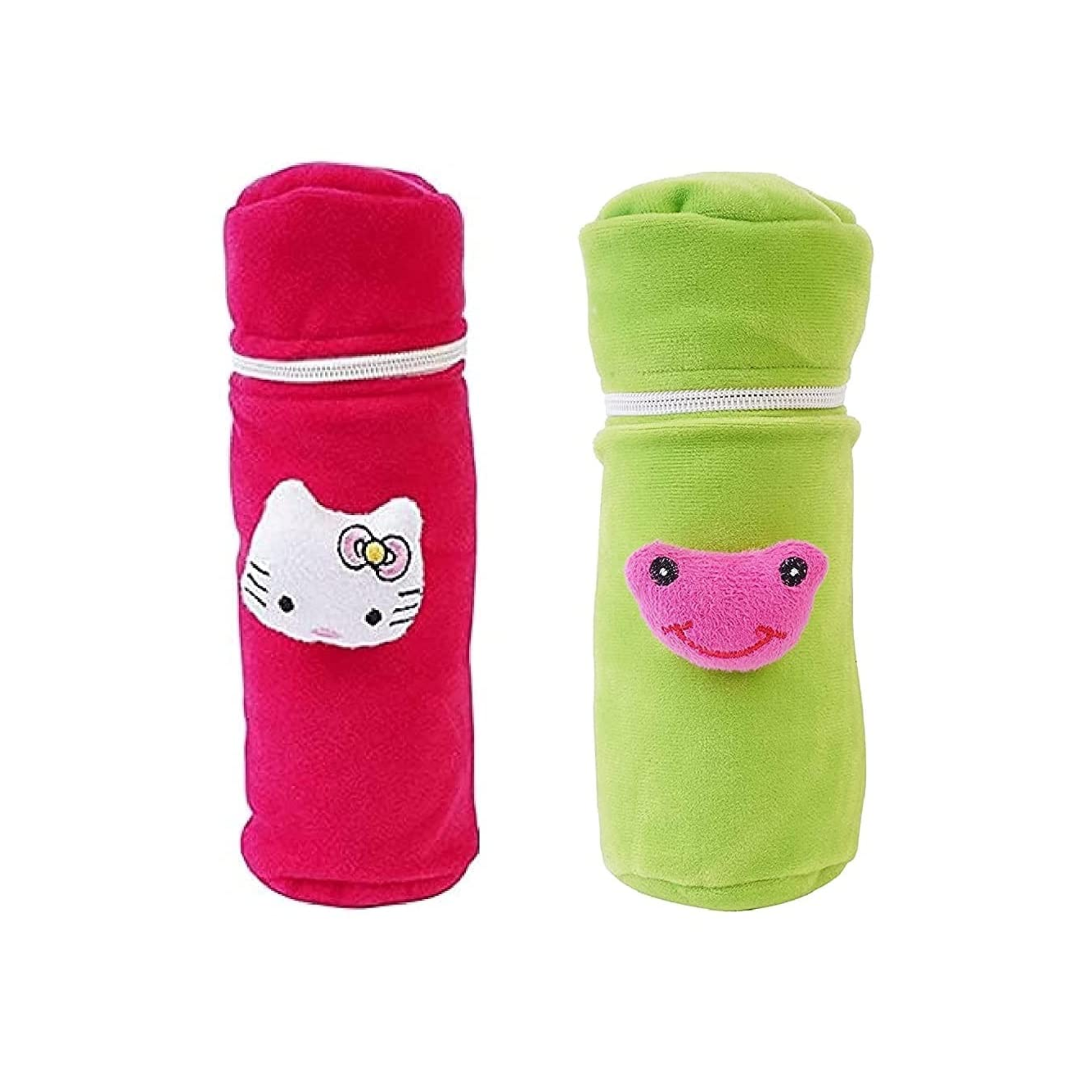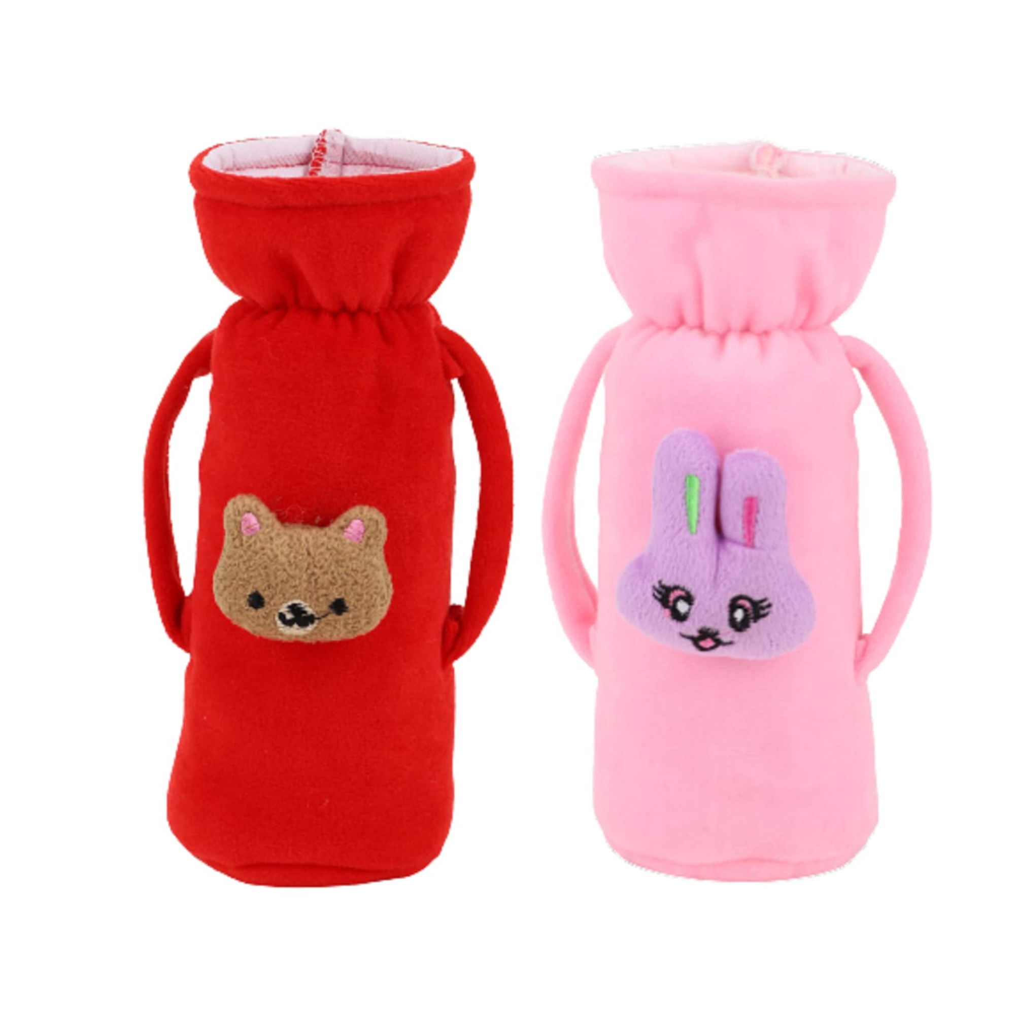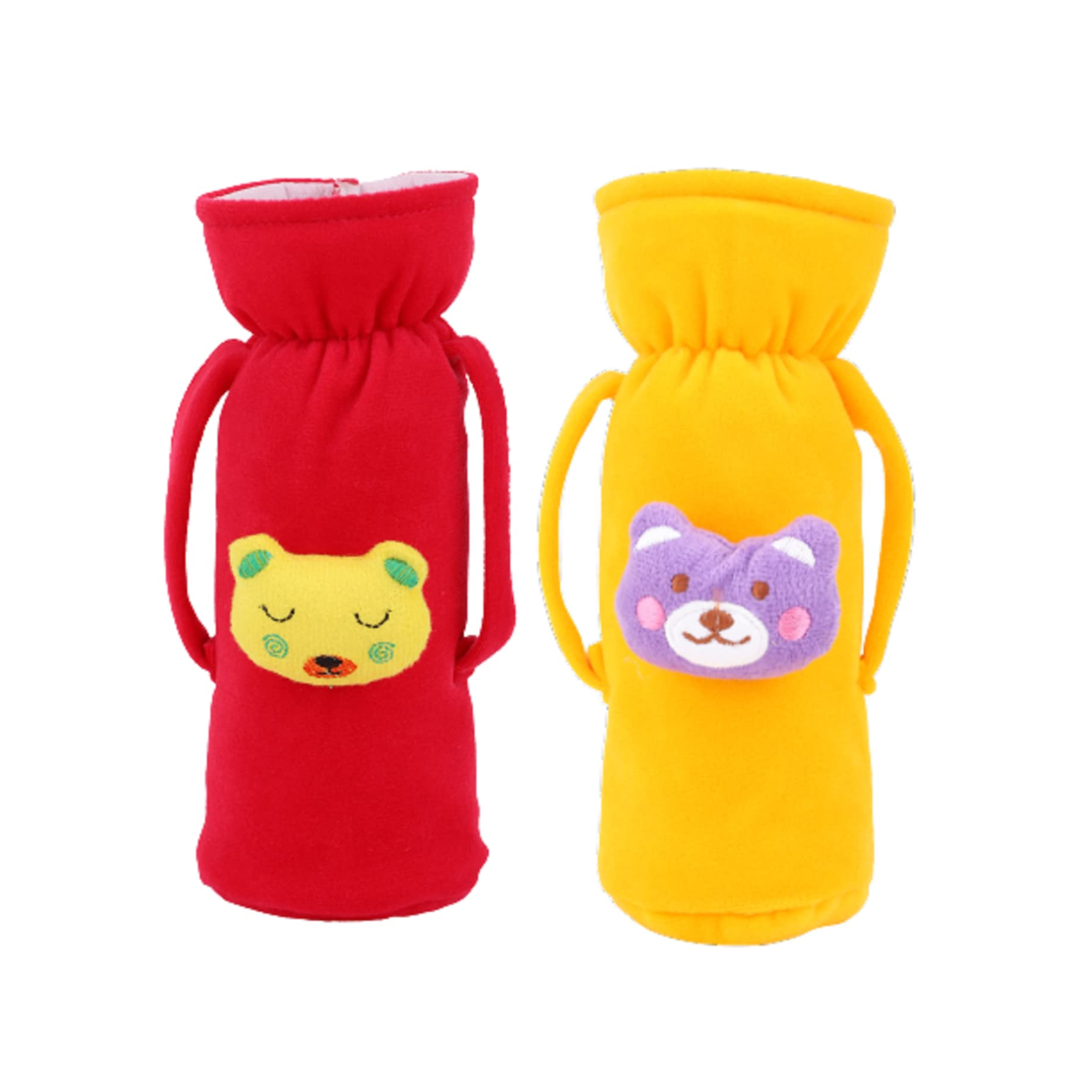 Soft plush stretchable feeding bottle covers with secure zipper closure, designed for 120–250 ml bottles. Adorable animated designs keep feeding fun while protecting bottles. Comes in a pack of 2.