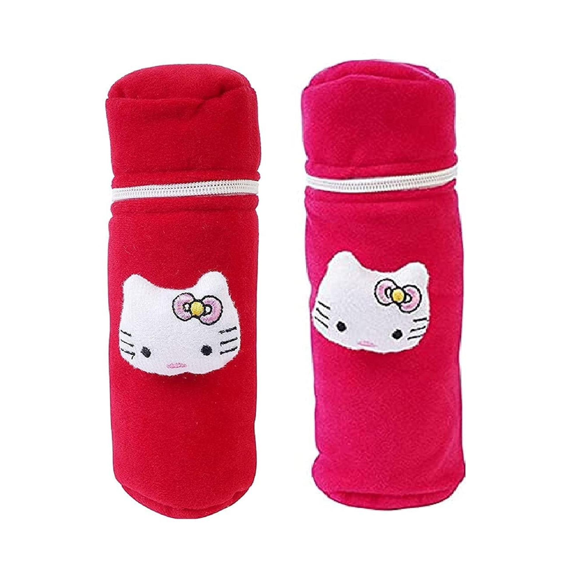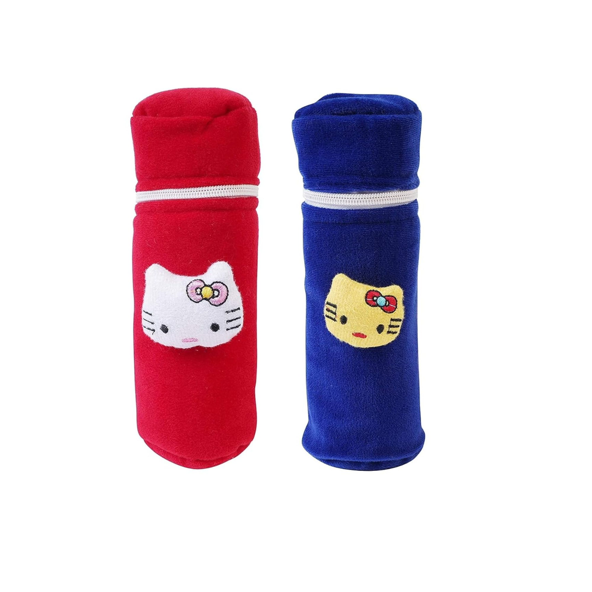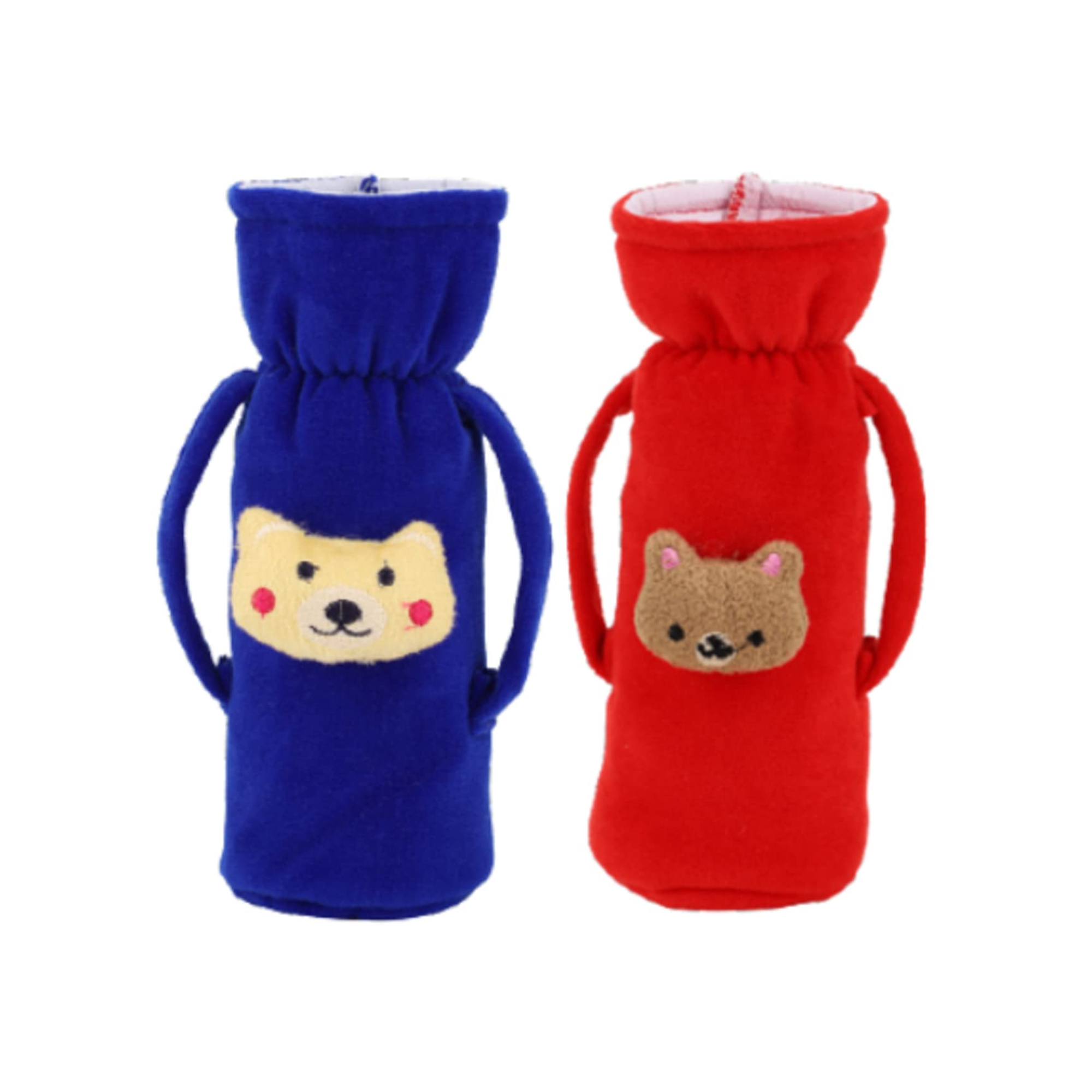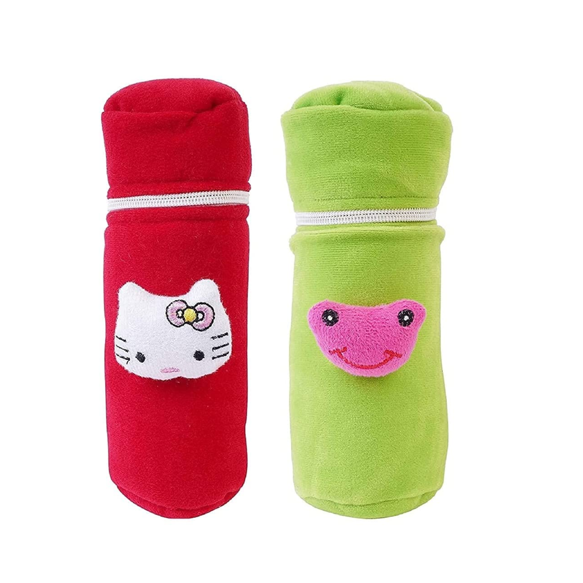 Soft plush stretchable feeding bottle covers with secure zipper closure, designed for 120–250 ml bottles. Adorable animated designs keep feeding fun while protecting bottles. Comes in a pack of 2.