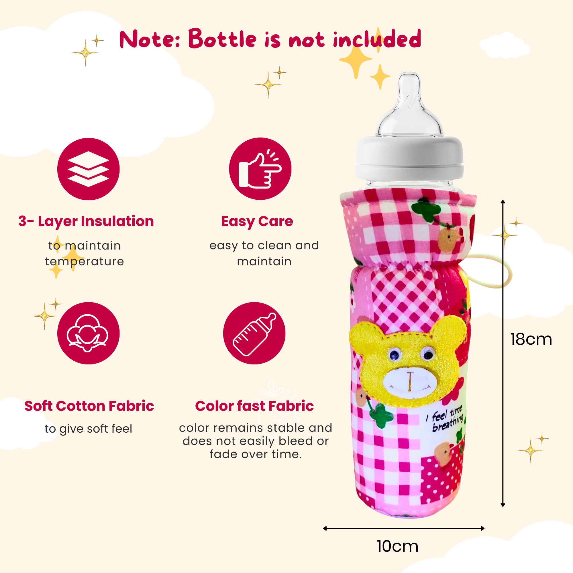 Check Textile Baby Feeding Bottle Cover with Strap & Cartoon Print, Fits 60ml–125ml Bottles