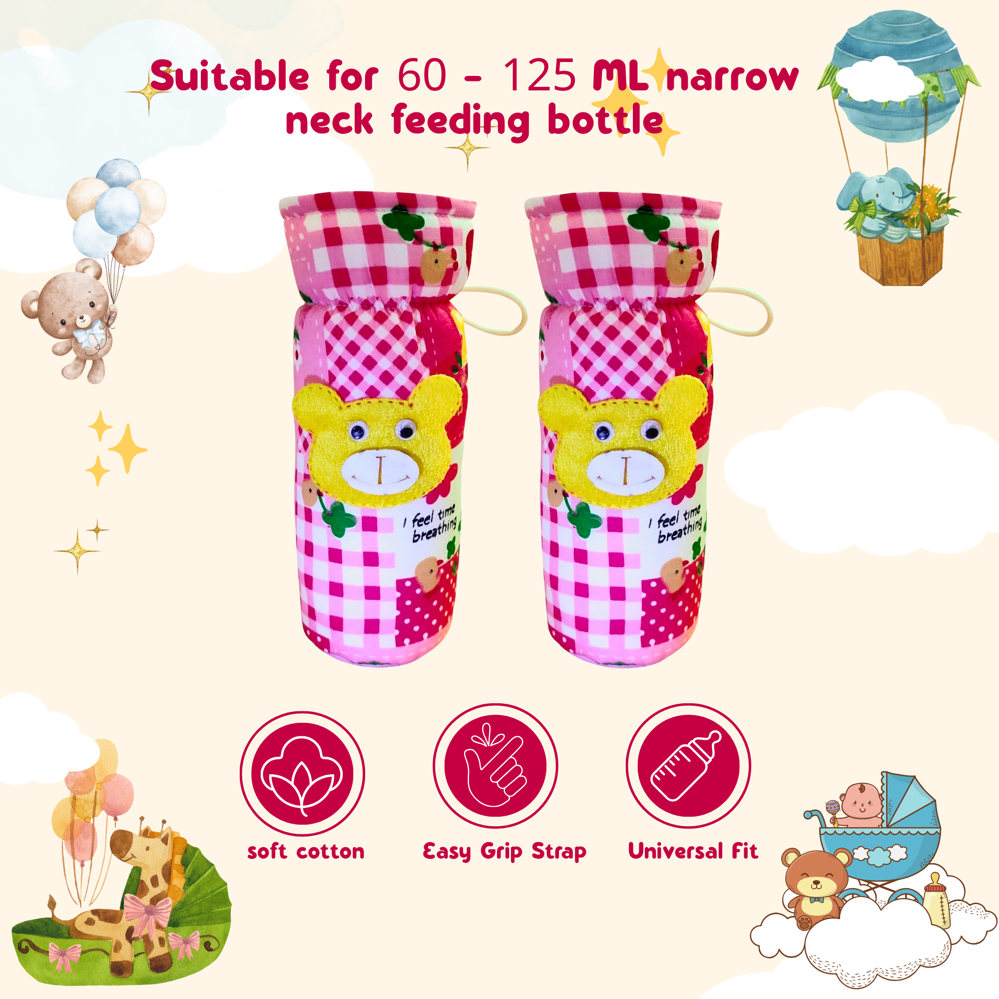 Soft check-textile baby feeding bottle cover with animated cartoon print and easy-to-hold strap. Fits 60ml–125ml bottles perfectly, offering comfort, protection, and style.