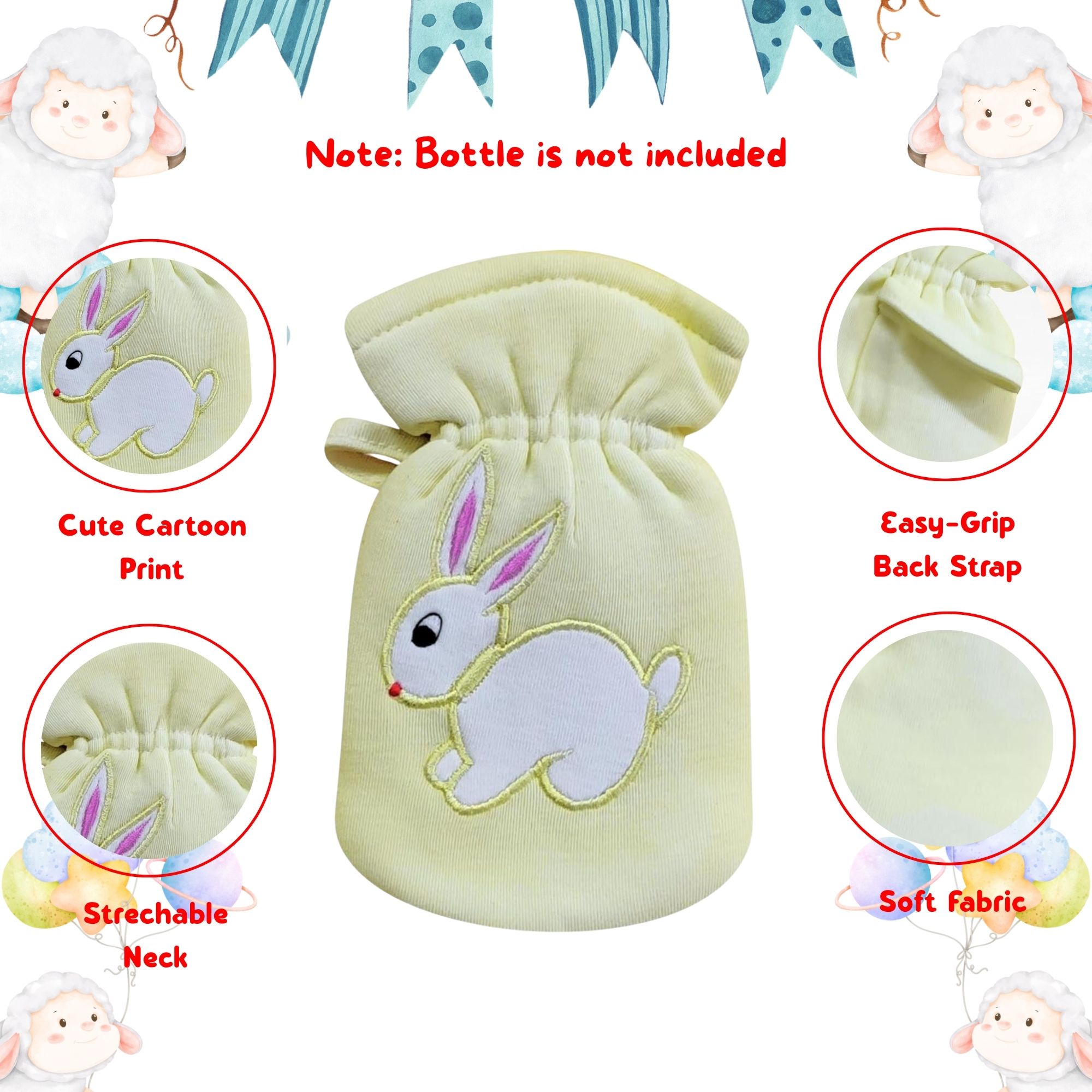 Soft and stylish cotton baby feeding bottle covers designed with adorable embroidered cartoon patches. This set of 2 modern tote-style carriers fits bottles from 60ML to 125ML, providing a comfortable grip, dust protection, and temperature balance for your baby’s bottle.