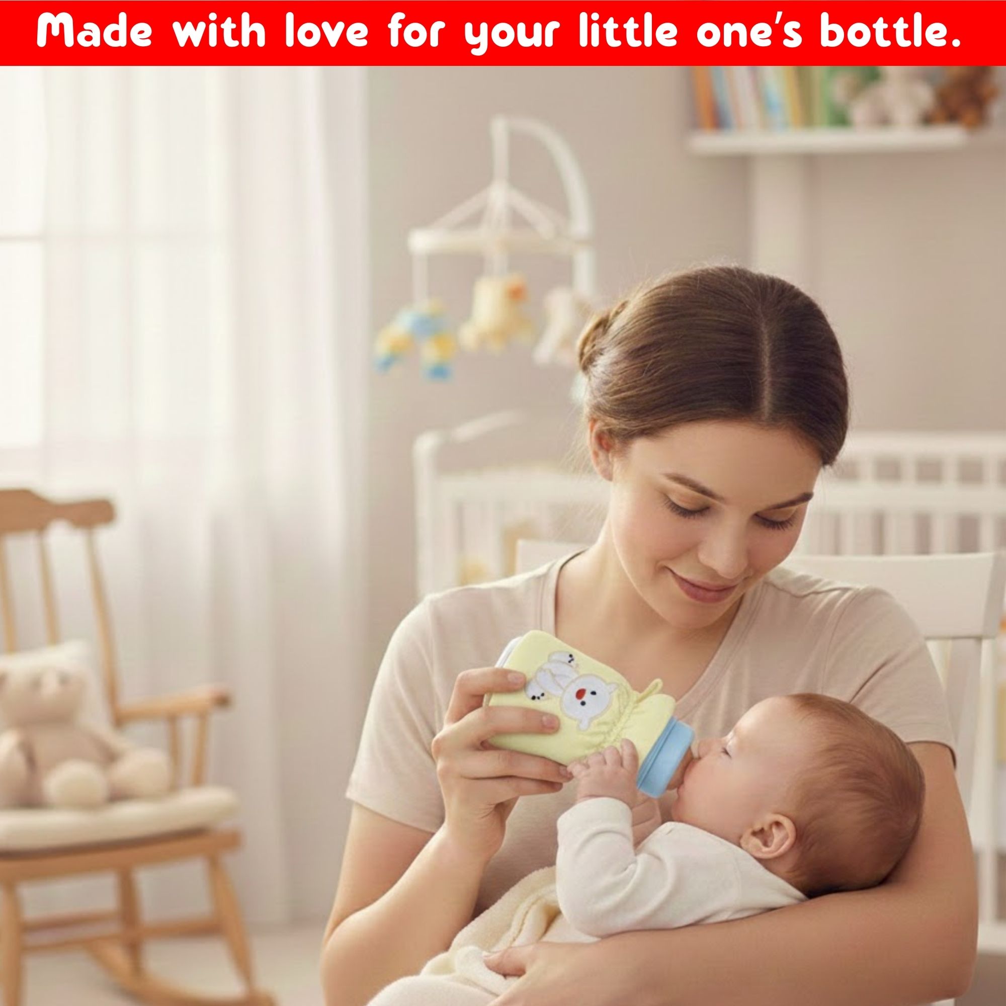 Cotton Baby Feeding Bottle Cover Set of 2 – Embroidered Cartoon Patch, Modern Tote Style, Fits 60–125ML Bottles, Soft & Washable Baby Bottle Carrier
