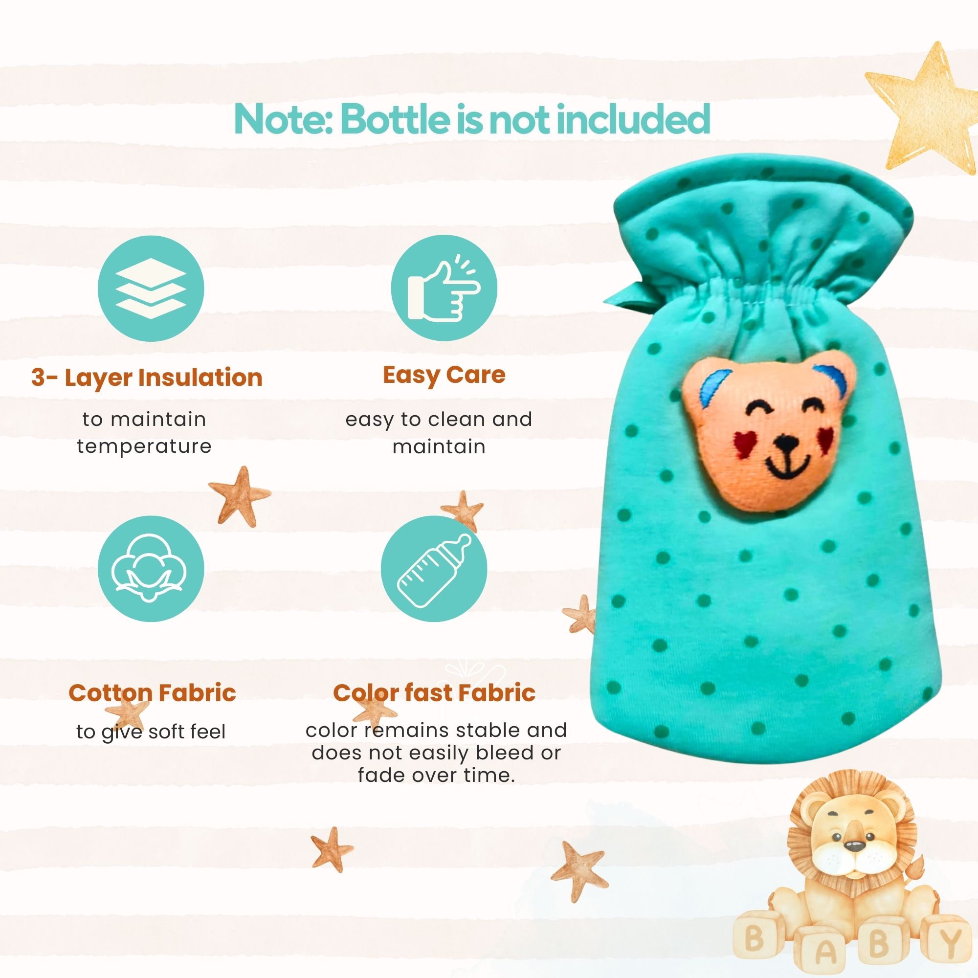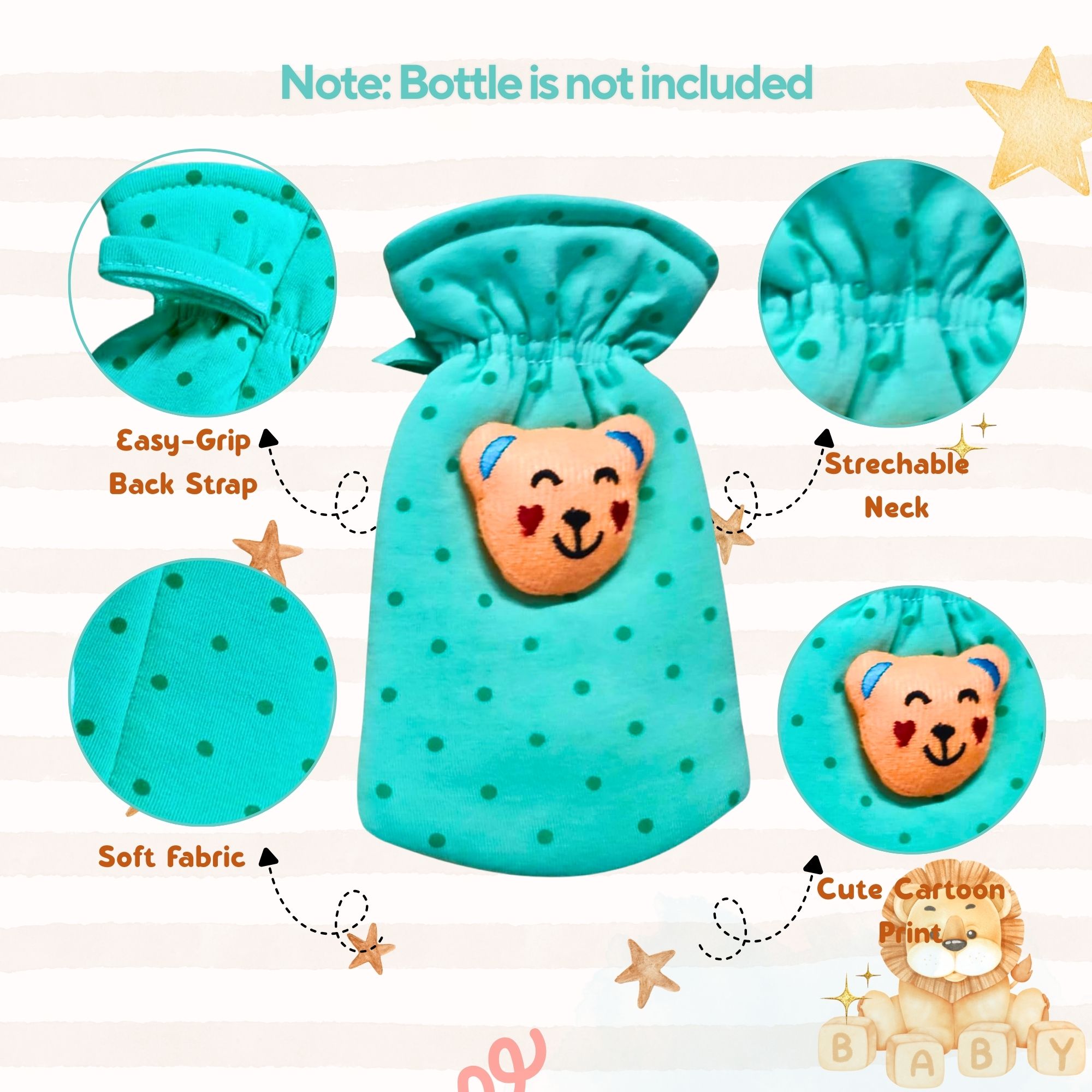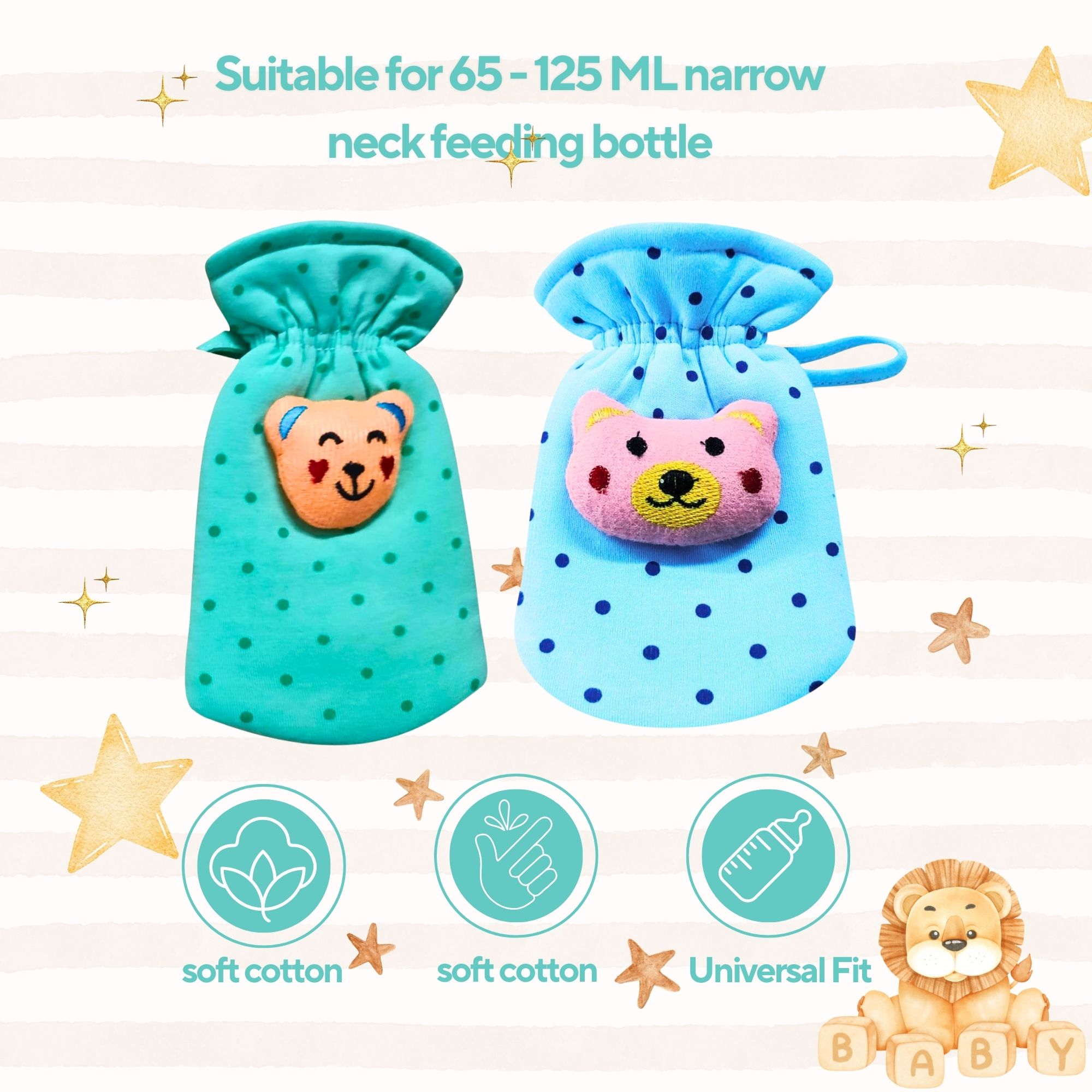 Keep your baby's feeding bottles protected and adorable with these soft cotton covers. Designed with cute dot cartoon prints, they fit bottles from 60 ml – 125 ml and keep the milk warm longer.