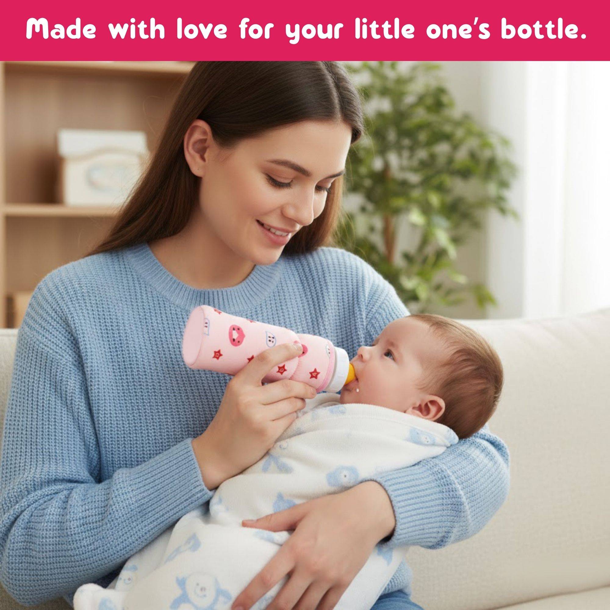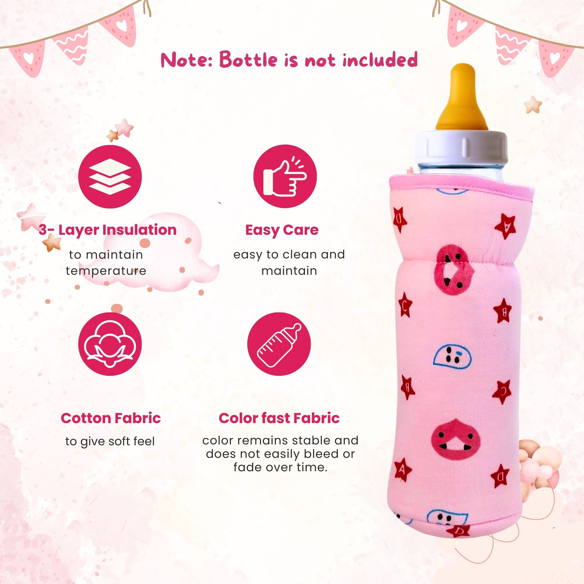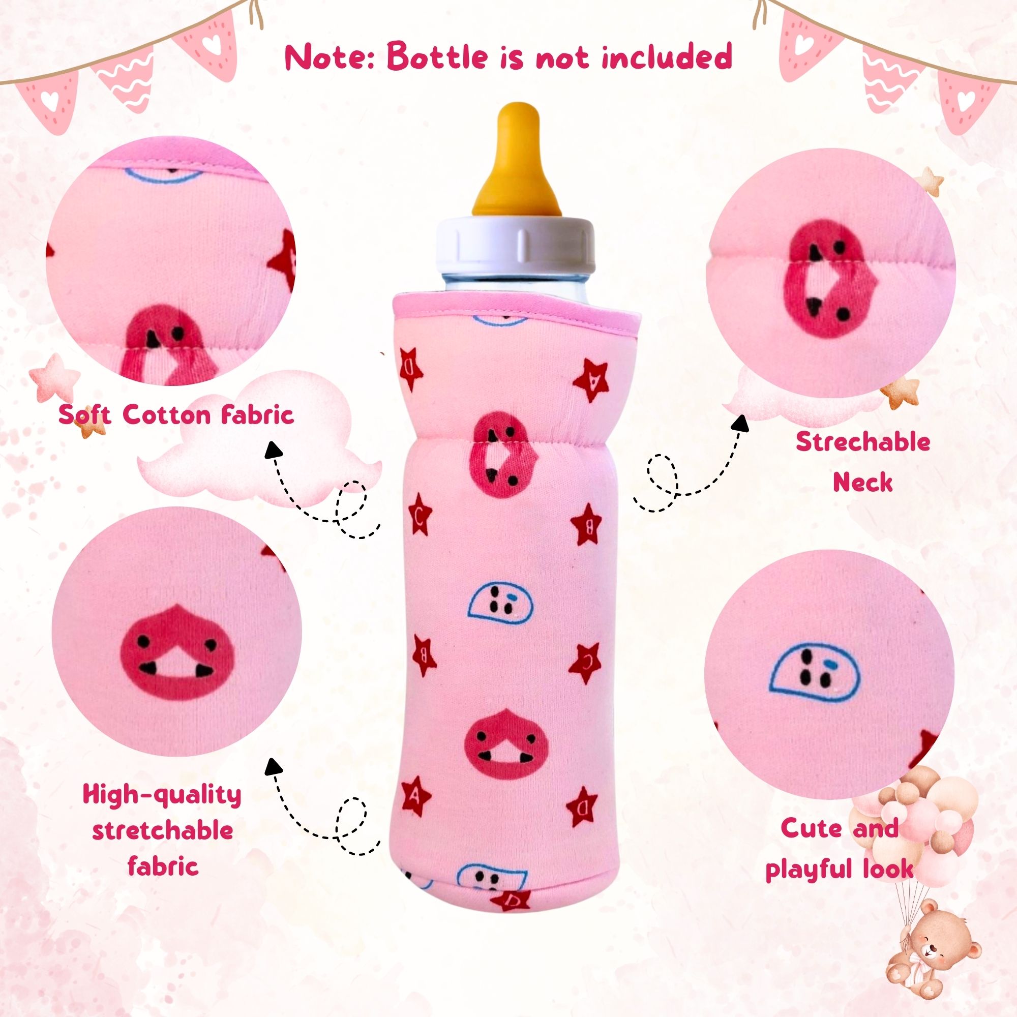 Soft, stretchable baby feeding bottle cover with a cute star print and easy-to-hold strap. Perfect fit for 60ml–125ml bottles to keep feeding time clean, comfortable, and stylish.