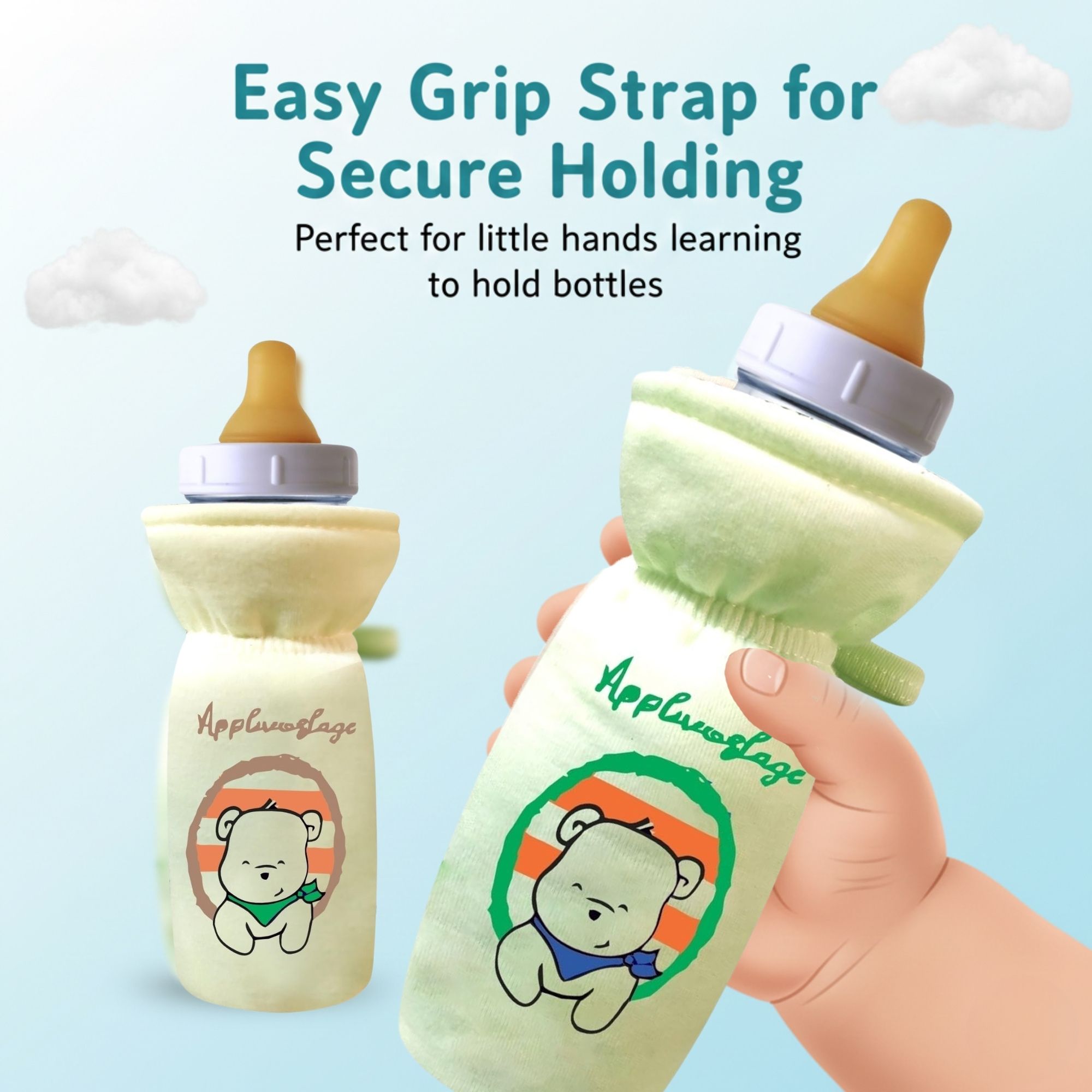 The easy-to-hold strap design supports both parents and babies, ensuring a comfortable grip while feeding. Its non-slip, lightweight texture adds safety, and the soft stretchable fabric shields bottles from bumps and scratches.